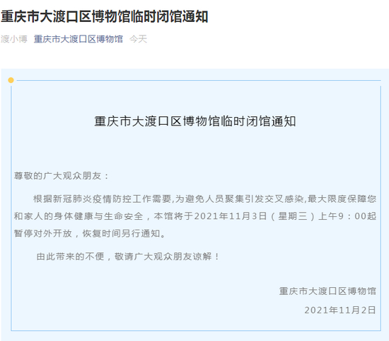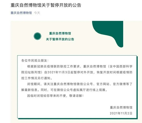 从2021年11月3日(星期三)起,重庆科技馆暂停开放,具体开馆时间另行通知。