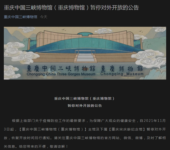 自2021年11月3日起,[重庆中国三峡博物馆(重庆博物馆)]主馆及下属[重庆宋庆龄纪念馆]暂停对外开放,恢复开放时间另行通知。请关注重庆中国三峡博物馆的官方网站、微信、微博,及时了解相关信息。给您带来的不便,敬请谅解!