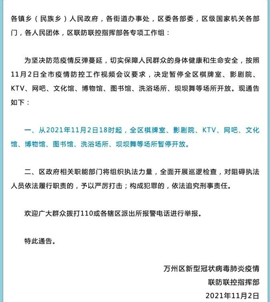 一、从2021年11月2日18时起,全区棋牌室、影剧院、KTV、网吧、文化馆、博物馆、图书馆、洗浴场所、坝坝舞等场所暂停开放。