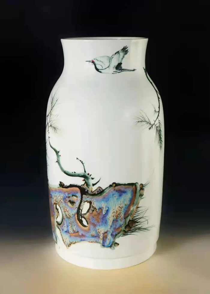 因此,松鹤也常作为有志有节的象征。在瓷器上,利用这“松鹤”代表性符号进行描绘,是对典型中国传统文化符号的提炼与再创作,实现中国传统文化特色与现代技艺相结合,展现瓷器艺术古典性与当代艺术风格的结合。