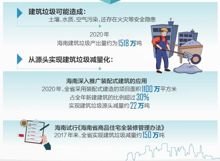 近年来,海南城乡发展日新月异,老旧小区改造、新房装修、商务楼宇扩张、道路建设、乡村振兴……各地开发建设需求源源不断。尽管海南正在深入推广装配式建筑,但新旧工艺、理念的更迭需要时间——2020年全省新建的建筑里,仍有相当一部分采用的是传统建造方式。
