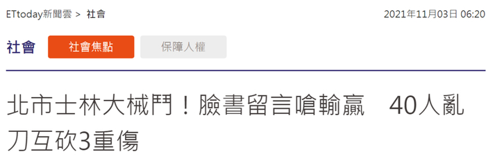 “ETtoday新闻云”、“今日新闻网”等台媒消息,台北市士林区延平北路九段3日凌晨1时左右发生大规模械斗,近40人相约在社子岛某工厂前谈判,双方疑因一则脸书留言起口角,不料谈判破局,爆发流血冲突,双方乱刀互砍、砸车,有3人倒卧血泊中,警方赶往现场逮捕多人,并将现场3名伤者送医。