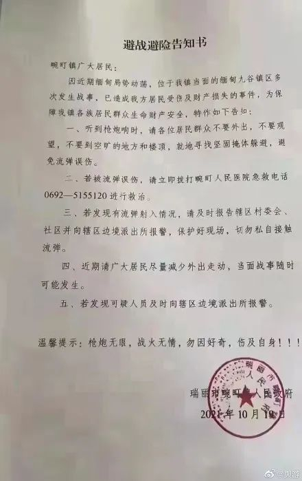 畹町镇区与缅甸九谷镇区仅一河之隔,尤其是畹江路以南区域,民房紧临界河,距离边境线近则几米远不过百米。畹町镇10月19日发布《避战避险告知书》,提醒居民“由于畹町镇对面的缅甸九谷(棒赛)镇区多次发生战事,已造成我方居民受伤及财产损失的事件,特告知居民尽量减少外出,在听到枪炮响时就地躲避。”