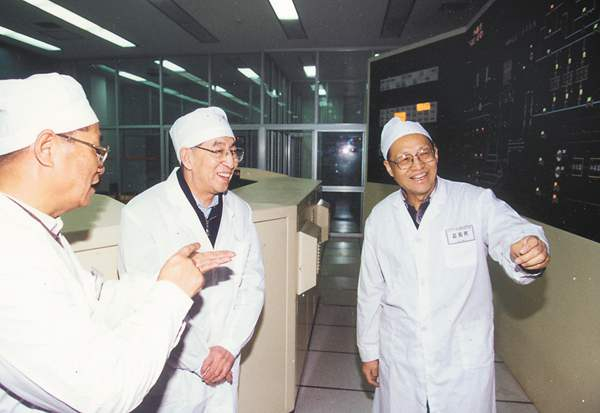 王大中是国际核能领域的著名学者、战略科学家,致力于发展具有固有安全特性的先进核能系统。他带领产学研联合团队实现了我国高温气冷堆技术从跟跑、并跑到领跑的整体发展过程,为我国在先进核能领域逐步走向世界前沿奠定了重要技术基础。图为王大中(中)在清华大学10兆瓦高温气冷堆临界现场。(清华大学供图)