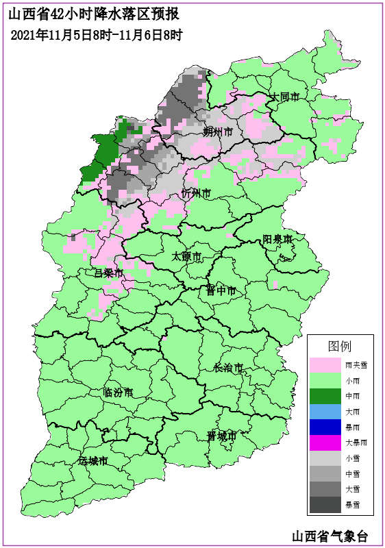 11月5日白天到夜间:全省阴天,大部分地区有小雨或雨夹雪,北部部分地区有中到大雪或中雨。