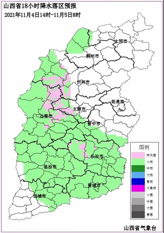 11月4日下午到夜间:全省多云转阴天,北部局部和中南部大部分地区有小雨或雨夹雪;中南部部分地区有轻雾或轻度霾。