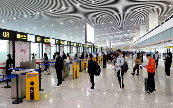 乘客有序排队 重庆机场集团供图针对无法使用智能手机出示健康码的旅客,机场提供“刷身份证核验健康码”服务。