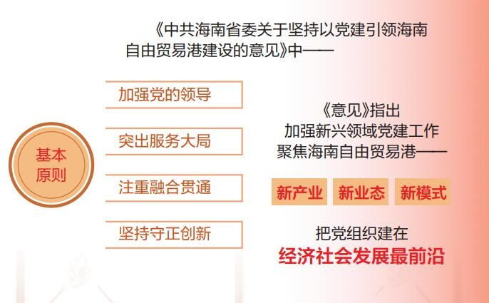 做好新兴领域党建工作,是实现城市基层党建整体提升的关键所在。日前,中共海南省委印发《中共海南省委关于坚持以党建引领海南自由贸易港建设的意见》(以下简称《意见》),提出要加强新兴领域党建工作,聚焦海南自由贸易港新产业、新业态、新模式,把党组织建在经济社会发展最前沿。