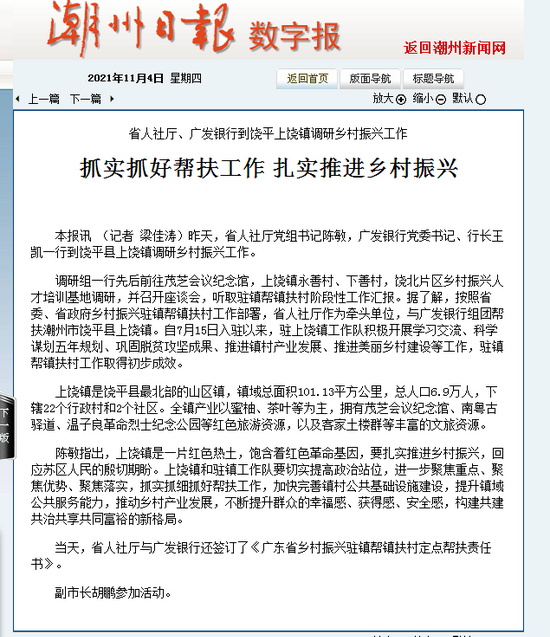 据潮州日报消息,11月3日,省人社厅党组书记陈敏,广发银行党委书记、行长王凯一行到饶平县上饶镇调研乡村振兴工作。