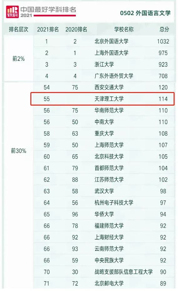 10月25日,软科发布“2021中国最好学科排名”。其中,外国语言文学学科排名共有118所大学上榜,我校外国语言文学学科排名55,位列前30%。