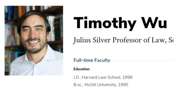 49岁的哥伦比亚大学教授吴修铭在国家经济委员会担任总统科技与竞争政策特别助理。作为互联网法律与政策专家,他对科技巨头垄断问题立场强硬。