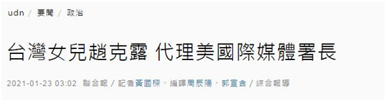 赵克露被拜登任命为美国对外广播事务的美国国际媒体署代理执行长时,台媒也颇为自嗨,直呼“台湾女儿上任”。