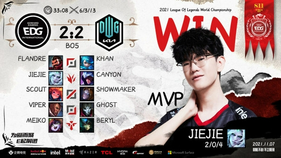 第二局,EDG第二条小龙团战不利,DK拿下人头和火龙,进入运营节奏。危急关头,Jiejie抢下大龙魂,为EDG续命。随后的小龙坑团战,EDG未能顶住伤害,DK拿到听牌水龙,随后蚕食地图资源滚起雪球,最后推掉中路高地,1比1。