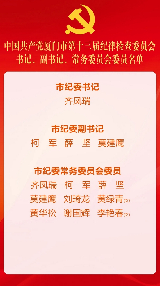 11月7日上午,中国共产党厦门市第十三届纪律检查委员会第一次全体会议召开。本次会议选举产生了中共厦门市第十三届纪律检查委员会常务委员会委员和书记、副书记。齐凤瑞当选为市纪委书记,柯军、薛坚、莫建鹰当选为市纪委副书记。齐凤瑞、柯军、薛坚、莫建鹰、刘琦龙、黄绿青(女)、黄华松、 谢国辉、李艳春(女)当选为市纪委常务委员会委员。齐凤瑞同志主持会议并作讲话。