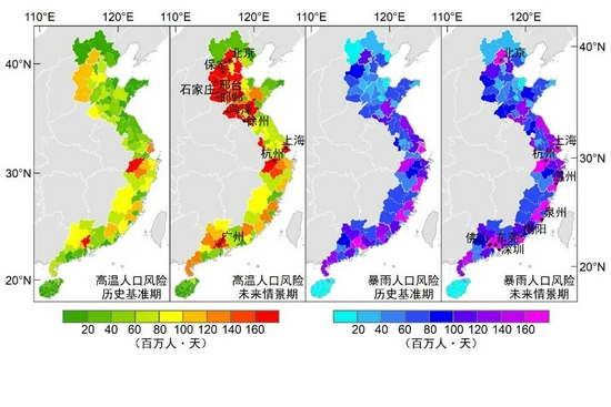 澎湃新闻:能否介绍一下您的研究成果?孙劭:这项研究从高、中、低三种温室气体排放情景和人口增长情景出发,预估了2021-2050年中国东部地区(划分为京津冀鲁、江浙沪和闽粤琼三个子区域)高温和暴雨事件的变化趋势,揭示了这些地区的89个主要城市受高温和暴雨影响的潜在人口风险水平。