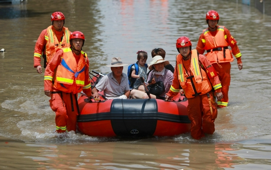 河南郑州极端降雨事件后救援民众。