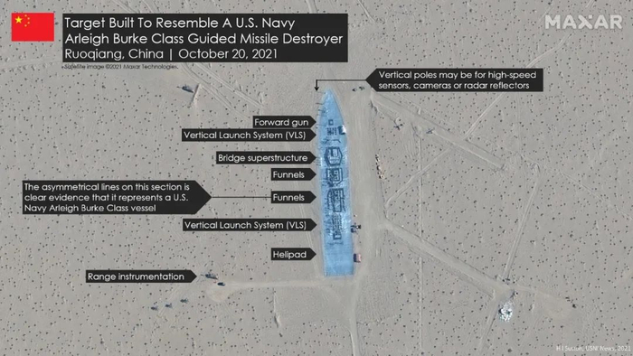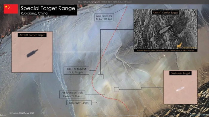 例如美国Maxar公司提供的卫星照片显示,在新疆若羌地区新发现的设施包括等比例的美军航母以及至少两艘“阿利·伯克”级驱逐舰轮廓的标靶,“这里的位置与解放军早先测试‘航母杀手’‘东风-21D’反舰弹道导弹的靶场相当接近”。