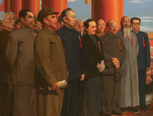为体现开国大典是人民的伟大胜利,董希文采用了把天安门城楼上的国家领导人与广场上的群众尽收于同一画面的“大团圆”构图。领导人占据画面左侧,严肃庄重,仪表姿态被刻画得惟妙惟肖,内在气质充分显露;右侧为广场上的群众,放眼望去,井然有序。整个画面形成左实右虚、左近右远、又相互呼应的布局。