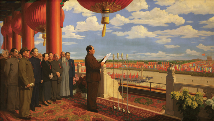 20世纪50年代初,董希文根据这一载入史册的重要事件,历时两个多月,创作出油画《开国大典》。该作品后经靳尚谊、赵域临摹,闫振铎、叶武林修改。