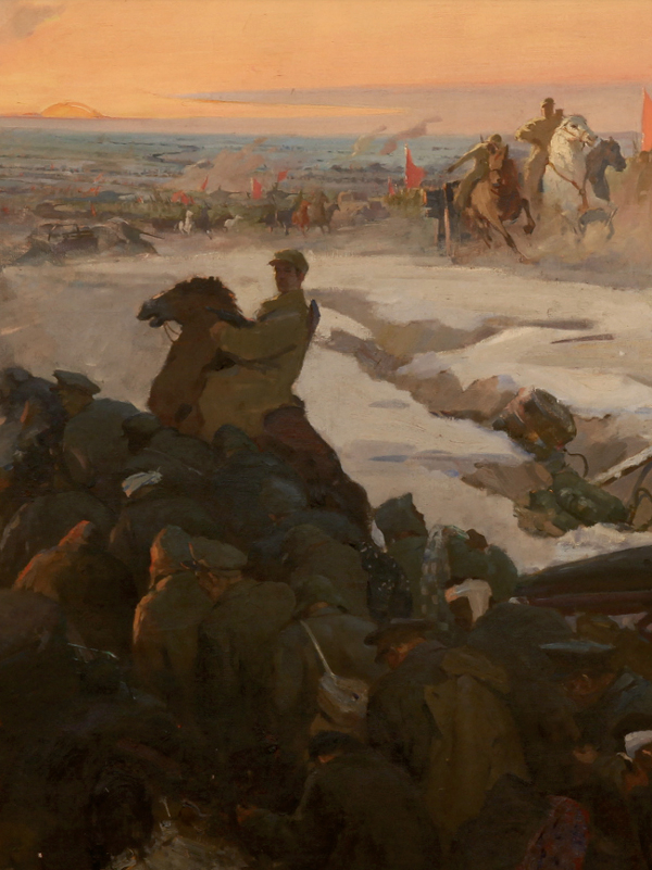 作品构图严谨,画面通透,纵深感强,整体洋溢着希望、光明与自豪。行进中的解放军战士身披金色阳光,踏着厚厚的积雪,阔步前进,以豪迈步伐从一个战场走向另一个战场,从胜利走向新的胜利。队伍前方,支前民众推着满载的独轮车的一幕,动人心弦,让人不由想起陈毅将军所说:“淮海战役的胜利,是人民群众用小车推出来的。”