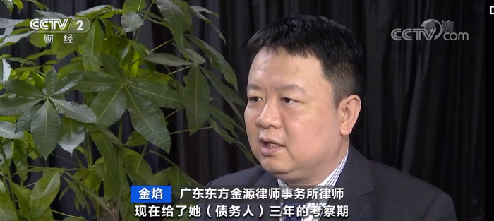 广东东方金源律师事务所律师 金焰:现在给了债务人三年的考察期,考察期之内,有相关的委员会专门去监督她,把剩余的收入用于支付相关的债务。所以对于债权人来说,也可以取得一定的金钱赔偿,去弥补债权人的损失。但是它最大的意义,就是使得这些诚实而不幸的债务人,获得新生的机会。