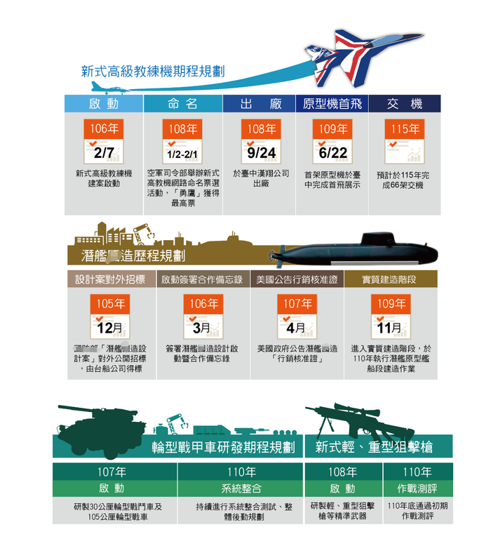 在本土防卫方面,台军建置防御性水雷、地雷反制敌三栖登陆;采购M1A2T 新型坦克及 M109A6 自行火炮,强化地面打击与火力支援能力;增购陶-2B及“标枪”高性能反装甲导弹,强化地面部队机动打击战力;计划发展陆射剑二新型野战防空武器系统,及增购便携式毒刺防空导弹,更新野战防空雷达,削弱空中攻击威胁;计划制造轻重兵器、单兵装具及训场设施,提升后备整体战力。