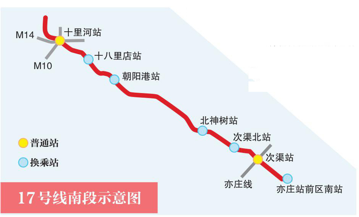 17号线是条位于东部地区贯穿南北的骨干线路,年底计划开通的南段从十里河至亦庄站前区南,全长16.5公里,设7座车站,其中次渠站与亦庄线换乘、十里河站与10号线、14号线换乘。17号线为8A编组列车、全自动运行线路,最高运行时速100公里,也将是一条全路网载客容量大的快线。开通后,次渠地区至十里河乘车出行时间将缩短10分钟。