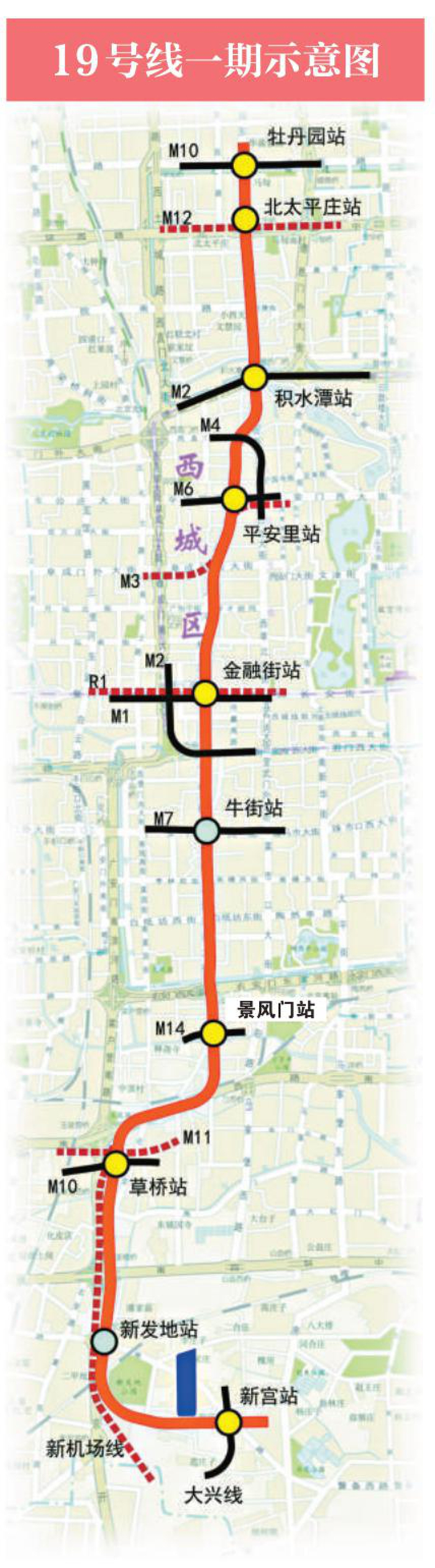 19号线是京城中部一条贯穿南北的动脉线,一期长22.4公里,设10座车站,除新发地站和牛街站,其余8站均为换乘站,分别与2号线、6号线、10号线等骨干线路换乘,特别是在草桥站可实现与大兴机场线换乘。19号线速度高、运量大,定员增加约60%,速度提升50%,乘客由新宫至金融街仅耗时15分钟,比目前乘坐4号线-大兴线节省约18分钟,预计对4号线-大兴线南段分流10%左右。同时,牡丹园至草桥可缩短30分钟。