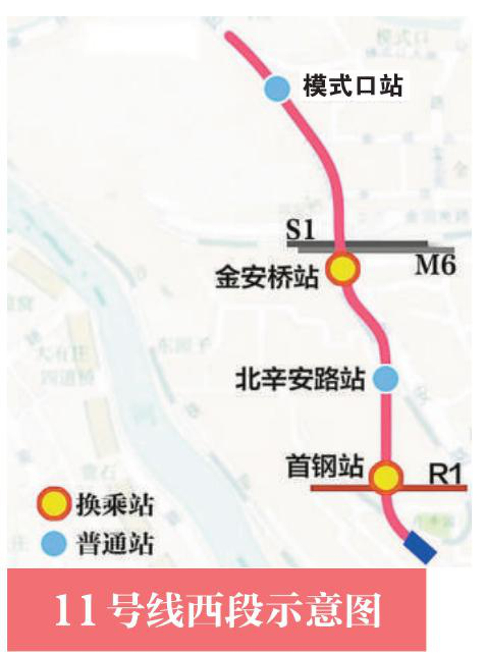 11号线西段(模式口站-首钢站)全长4公里,设站4座,在金安桥站与既有6号线、S1线换乘,在首钢站将与规划R1线换乘。该线将采用A型车、4辆编组,运行时速100公里。作为冬奥支线,11号线的车站和车厢内有丰富生动的冬奥元素。