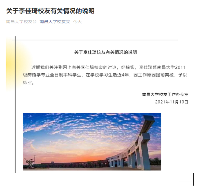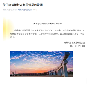 11月10日,南昌大学校友官方微信号发布说明回应李佳琦学历情况,称其因工作原因提前离校,已予以结业。以下为说明全文↓
