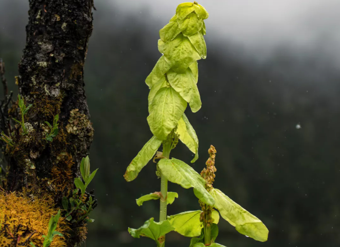 我们再来看照片中的紫花雪山报春,绿色的茎叶有一部分被冰雪掩盖,淡紫色的小花挤成了一团,好似绣球花一般,顶端还有未消融的冰雪。这时,人们大概率会猜这是冬天的照片。其实,这是6月的白马雪山忽然下了场雪而已。意外吗?紫花雪山报春的花期在5-7月,如果按传统的节气,5月立夏来说,那么到了夏季它才会迎来花期,这在报春花家族中算是花期较晚的物种了。