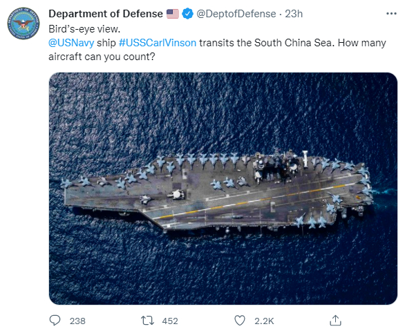 有分析称,随着中国军事现代化的快速推进,中国军力受到的关注也达到空前高度,前不久中国例行航天器试验引发的“轰动”就是例证。中国航母更是西方一直紧盯的“大工程”,甚至有网友戏言美西方已“偷窥成癖”。一边炒作中国军力发展,另一边美国频频炫耀武力。今年以来,美国航母已至少10次进出南海。10日,美国防部在推特上发布一张俯拍航母照片,并配文:“美国海军‘卡尔·文森’号航母经过南海。你能数出(甲板上)有多少架飞机吗?”