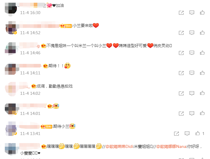 欧阳娜娜在微博评论区与妹妹欧阳娣娣互动。
