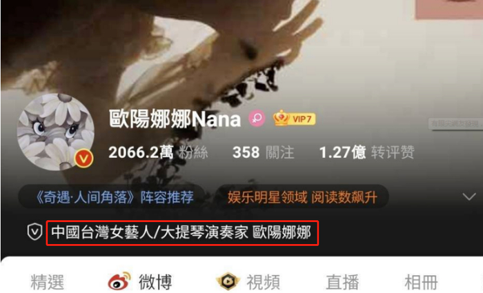“联合新闻网”还注意到,欧阳娜娜微博上的认证区文字上写着“中国台湾女艺人/大提琴演奏家欧阳娜娜”,而妹妹欧阳娣娣微博账号也一样写着“中国台湾女艺人”,引发热议。