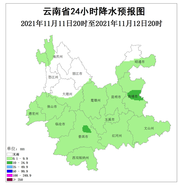 11月11日20时到11月12日20时:昭通南部、曲靖、昆明、楚雄、玉溪、文山、红河阴有小雨局部中雨,迪庆北部多云有阵雪,怒江北部、德宏、保山、大理南部、临沧、普洱、西双版纳多云有阵雨局部中雨,其他地区多云。