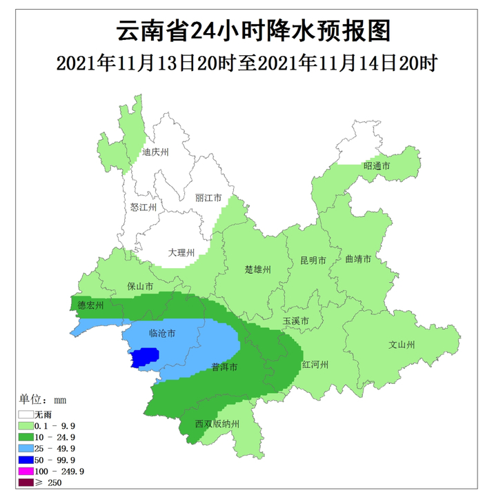 11月13日20时到11月14日20时:德宏南部、保山南部、临沧、普洱阴有中雨局部大雨或暴雨,昭通南部、曲靖、文山阴有小雨,迪庆北部多云有阵雪,怒江北部、德宏北部、保山北部、大理南部、丽江东南部、昆明、楚雄、玉溪、红河、西双版纳多云有阵雨局部中雨,其他地区多云。