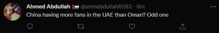 看台上震撼久违的“中国红”,也让不太清楚情况的巴勒斯坦网友稍显诧异:“中国在阿联酋的球迷比阿曼还多?奇怪哦。”↓