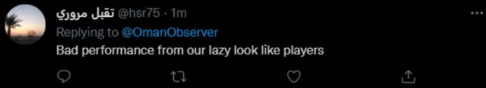 此时,被攻入一球的阿曼球迷显然不满意,有网友称:“糟糕的表现,来自我们看起来懒散的球员。”↓