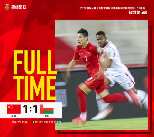 比赛下半场开始,第75分钟,阿曼队通过角球打进一球,中国队1:1阿曼队。