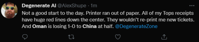 中场休息阶段,有阿曼球迷略显郁闷:“这不是一天的好的开始。打印机没纸了,我所有的上衣收据中间都有一条大红线。他们不会给我重新印的。然后阿曼队现在半场还输着中国队0:1。”↓
