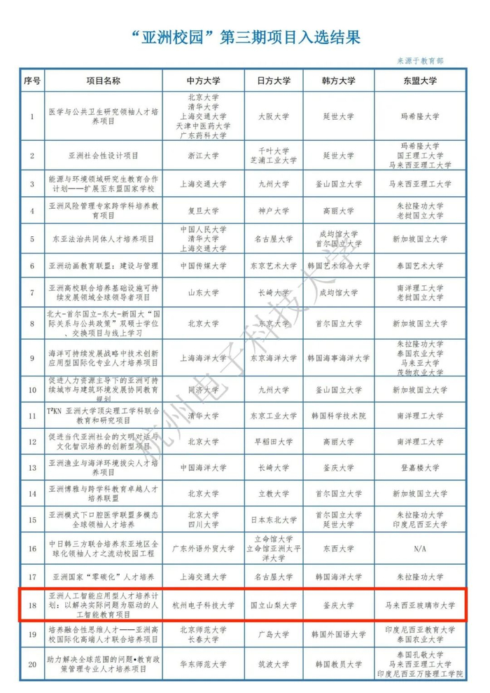 来源:杭州电子科技大学日前,教育部国际合作与交流司发布《关于公布“亚洲校园”第三期项目入选结果的通知》,共有北京大学、清华大学、上海交通大学、浙江大学等19所高校的20个子项目成功入选“亚洲校园”第三期项目。