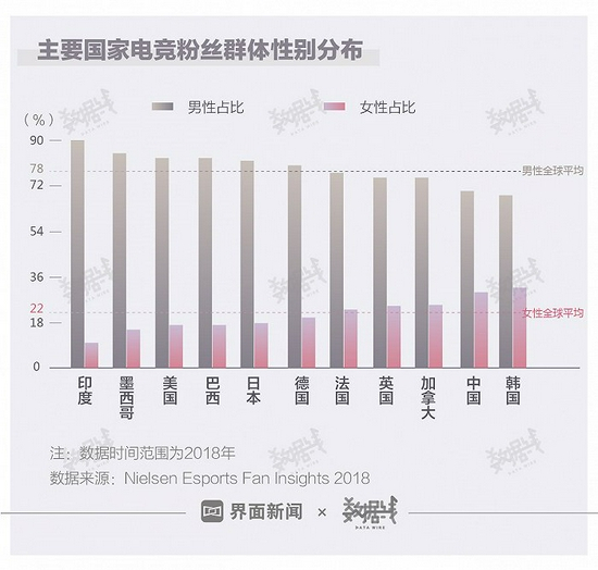 相比其他国家,中国女性更爱电竞,虽然“男粉”数量更多,但占比低于全球平均水平。据尼尔森2018年报告数据,全球11个国家中,法国、英国、加拿大、中国和韩国5个国家男性电竞粉丝占比低于全球平均水平(78%),女性电竞粉丝占比高于全球平均水平(22%)。美国、日本等国家男性粉丝占比均在8成以上,女性粉丝不足2成。