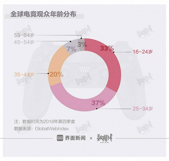 7成电竞观众年龄低于35岁。据GlobalWebIndex报告数据,2018年第四季度,全球电竞观众中,25岁至34岁的观众最多,占比37%。其次是16岁至24岁的观众,占比33%。