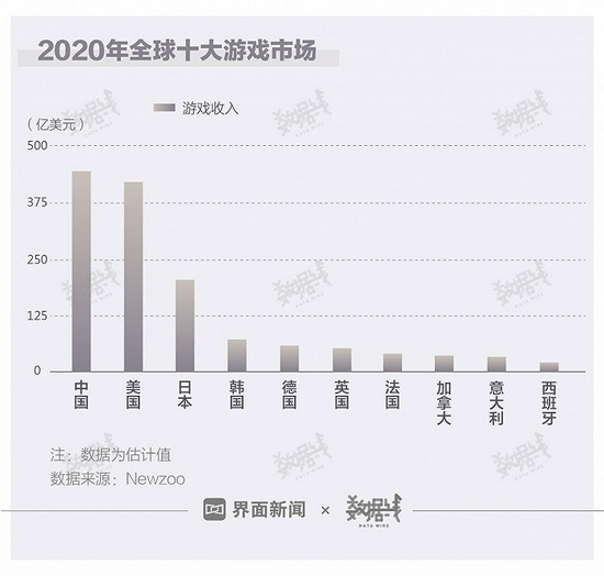 从整个游戏产业来看,中国也是全球最大的游戏市场。据Newzoo估计,2020年全球10大游戏市场中,中国排名第一,游戏收入约442.63亿美元。其次是美国,游戏收入约421.07亿美元。总体来看,全球10大游戏市场中,欧美国家有7个,亚洲国家除中国外,还有日本和韩国上榜。