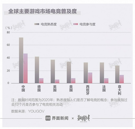 游戏大国中,中国电竞越来越火,但欧美国家对电竞的热情不高。YouGov2020年的一项调查显示,7个主要游戏市场中,只有中国对电竞的参与度较高。从电竞熟悉度来看,中国消费者对电竞熟悉度高达72%,其余6个主要游戏市场消费者对电竞的熟悉度均不到一半。从电竞参与度来看,中国消费者过去一年的电竞参与度接近5成,但其余6个市场的电竞参与度不足2成,在德国、英国、美国、法国4个国家,消费者电竞参与度不到1成。