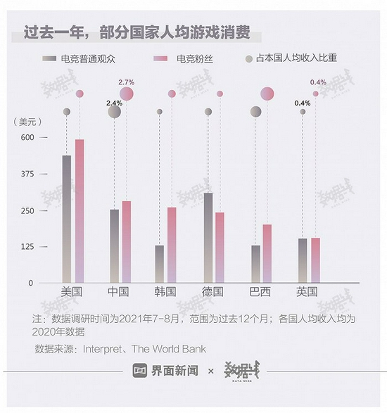 哪个国家的电竞粉丝最舍得花钱?据Interpret2021年最新统计,6个主要国家中,美国的电竞用户在游戏上开销最大,电竞粉丝人均年消费接近500美元(约合人民币3191元,依据实时汇率计算,下同)。其次是中国,电竞粉丝人均年消费为283美元(约合人民1806元)。对比各国2020年人均收入来看,中国粉丝更舍得花钱。6个国家中,中国电竞普通观众和电竞粉丝的人均年消费占收入比重都是最高的,分别为2.4%和2.7%。