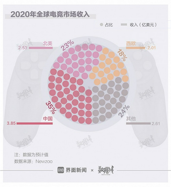 中国是全球最大的电竞市场。据Newzoo预测,2020年全球电竞行业收入将达11亿美元。其中,中国市场预计收入3.85亿美元,占比35%,为全球最高。北美和西欧市场收入均超过2亿美元,占比分别为23%和18%。