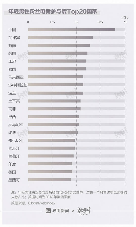玩游戏、看电竞比赛正在成为越来越多年轻人的休闲方式。但从全球范围来看,电竞在各国的受欢迎程度相差很大,众多游戏大国中,只有中国对电竞的热情格外高涨。是谁在关注电竞?各国电竞粉丝有哪些不同?