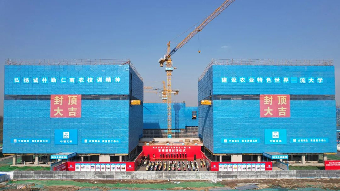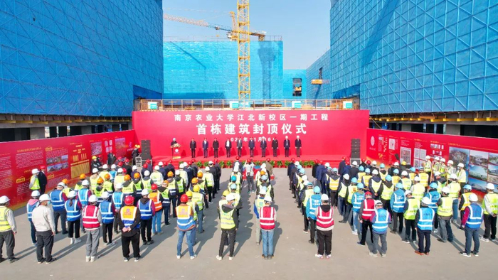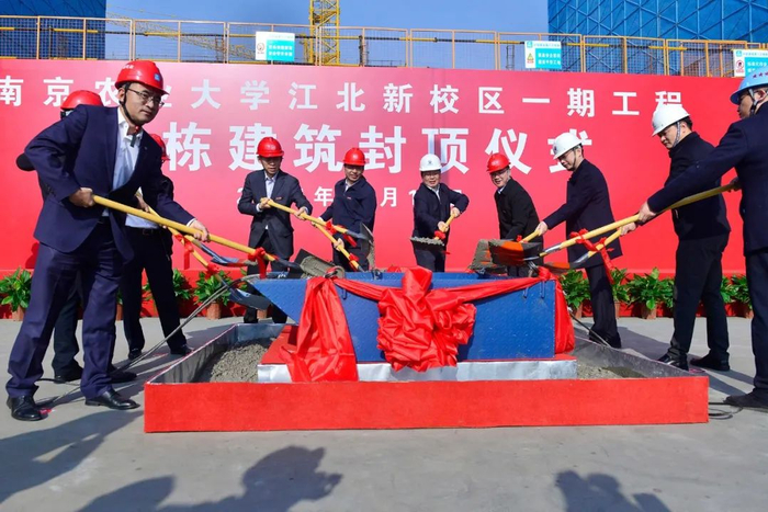 11月16日,南京农业大学举行江北新校区一期工程首栋建筑封顶仪式,标志着学校新校区建设取得重要进展。校党委书记陈利根,南京市城市建设投资控股(集团)有限公司总经理李雁,校党委副书记王春春,党委副书记、新校区建设指挥部总指挥刘营军,党委常委、副校长闫祥林,江北新区产业技术研创园党工委书记、管办主任蒋华荣,南京市城市建设投资控股(集团)有限公司副总经理程曦,江北新区管委会建设与交通局副局长王玉国等共同为南区博士生公寓楼铲装封顶混凝土。伴随着塔吊起吊、礼炮齐鸣,新校区一期工程首栋建筑正式封顶。
