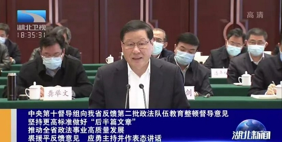 反馈会上,中央第十督导组组长裘援平反馈了对湖北省第二批政法队伍教育整顿督导意见。应勇主持并作表态讲话。